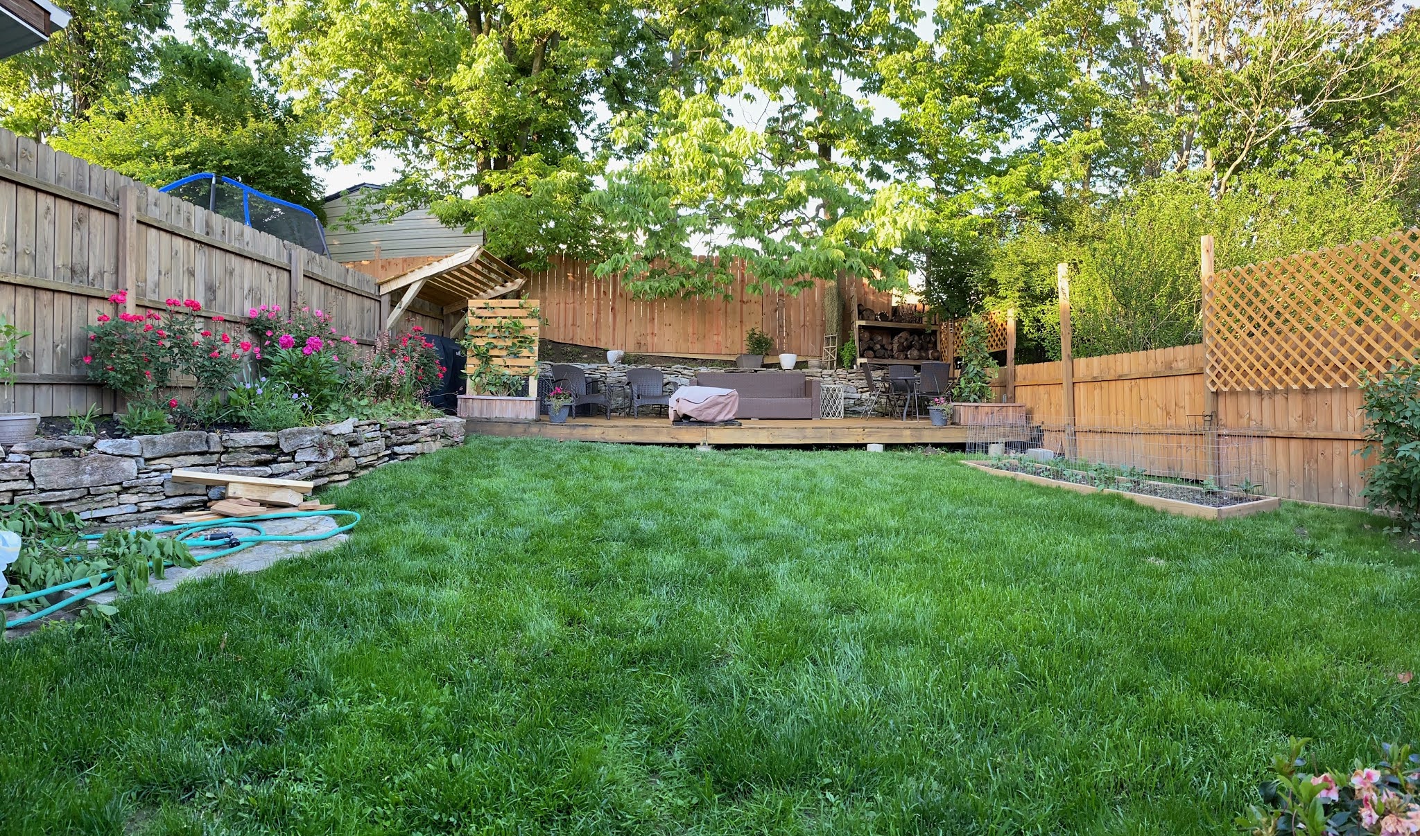 But then a setback occurred. “Last July I used a weed and feed on my grass and killed all of my grass,” she laughs. This is the lawn that she had carefully cultivated. Oops. “I was so devastated. I thought, well, I’ll just dig it all up. So I dug up half the lawn last year and planted sunflowers.” So she tilled the soil, mixed in compost, arranged the yard into a grid, laid out garden fabric, set up a drip line, planted flowers, and waited for the magic to unfold. And, boy, did it. She has sunflowers, roses, dahlias, snapdragons, tulips, daffodils, zinnias, and so much more in her bouquet of a back yard garden. The garden is a sensory delight. The accidental killing of her lawn lead her to something new and fascinating and beautiful.