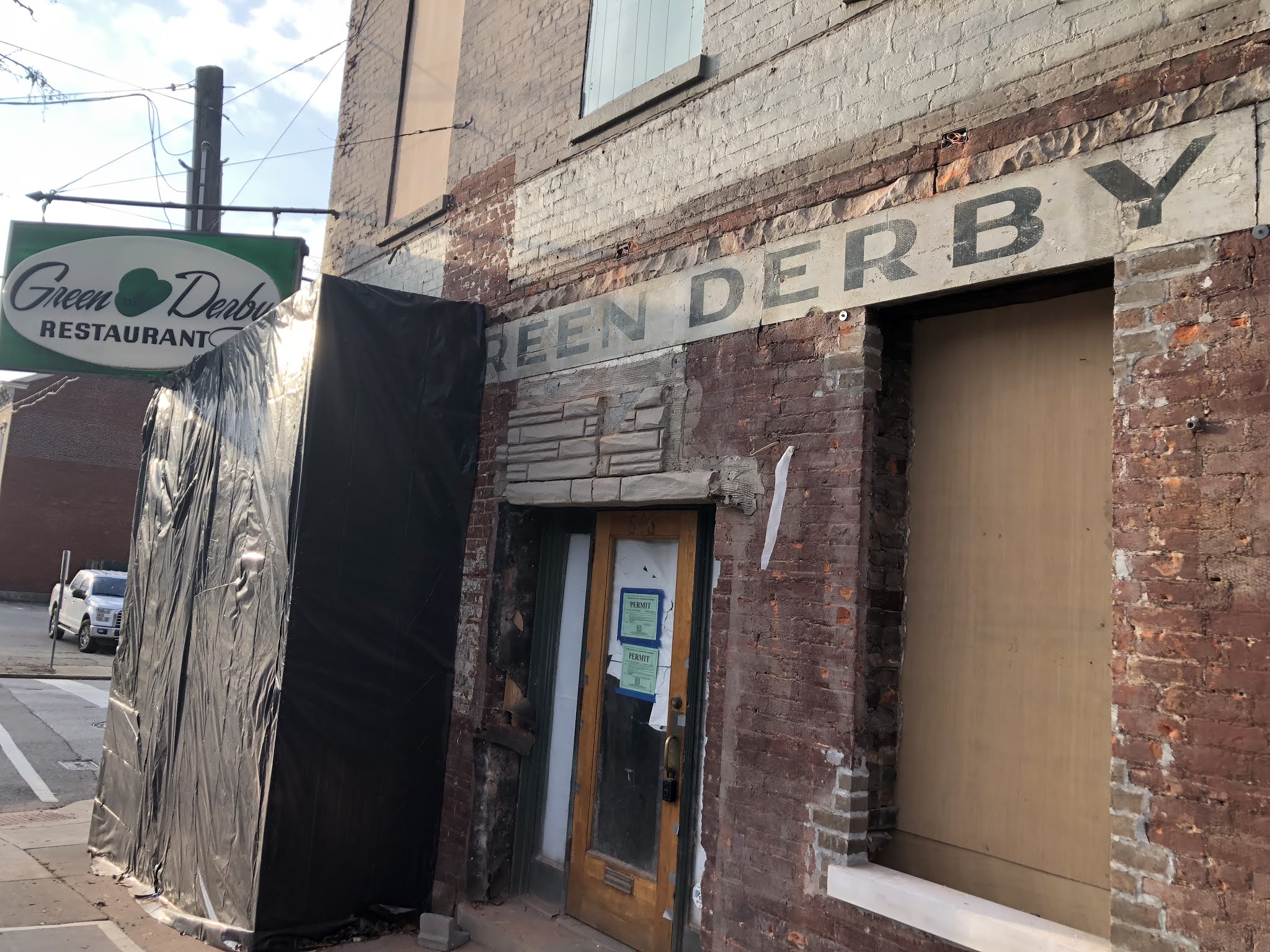 As part of the renovation, the Gosneys removed formstone, likely installed in the 1950s, from the facade, revealing the original brick construction, as well as a hand-painted “Green Derby” sign on the front of the building, likely dating back to the 1947 opening. It is that sort of historical detail that the Gosneys want to preserve and highlight, even if the new restaurant is not named the Green Derby.